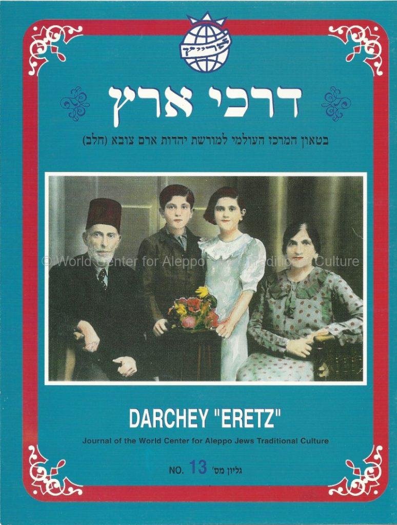 תמונת שער הקדמי: חכם משה בוואבה (צפדיה) מנהל ״תלמוד תורה״ בחלב, עם רעייתו בוליסה ונכדיו עזרא ועליזה טרזי – 1947. מאוסף עזרא טרזי.