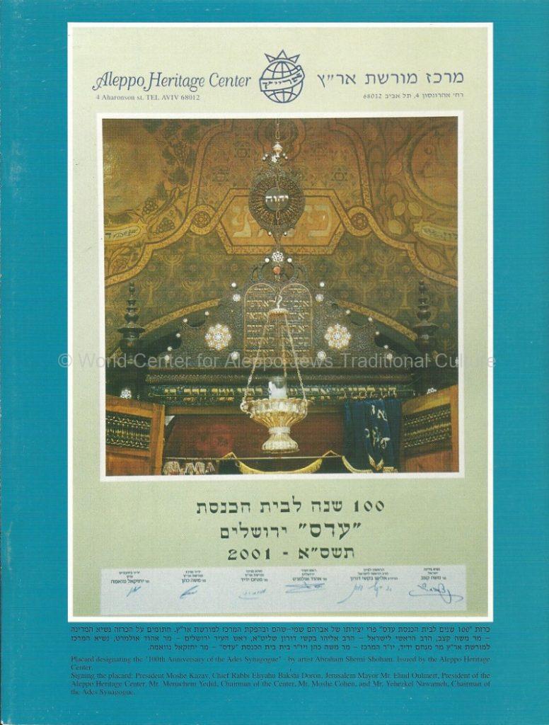 תמונת השער האחורי: כרזת "100 שנים לבית הכנסת עדס" פרי יצירתו של אברהם שמי-שהם ובהפקת המרכז למורשת אר״ץ. חתומים על הכרזה נשיא המדינה – מר משה קצב, הרב הראשי לישראל – הרב אליהו בקשי דורון זצ"ל, נשיא המרכז למורשת אר״ץ מר מנחם ידיד ז"ל, יו״ר המרכז – מר משה כהן ויו״ר בית בית הכנסת ״עדס״ – מר יחזקאל נוואמה ז"ל.