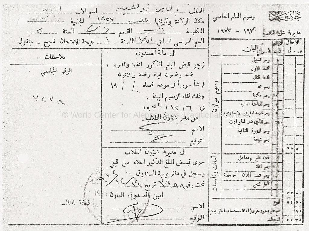 - קבלה עבור תשלום לאוניברסיטת חלב של הסטודנטית אליס כהן חלב סוריה 1972 73