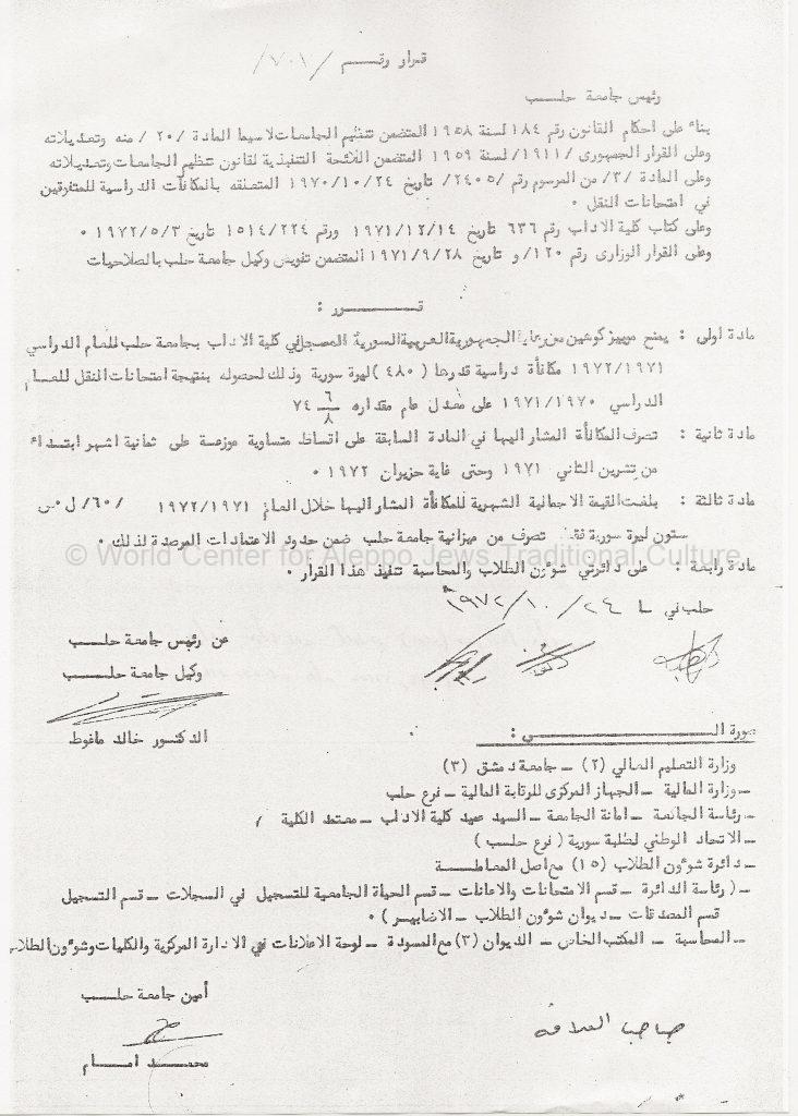 - תעודת הענקת מלגת הצטיינות למוייז משה כהן על הצטיינותו בלימודיו באוניברסיטת חלב בסוריה 1972