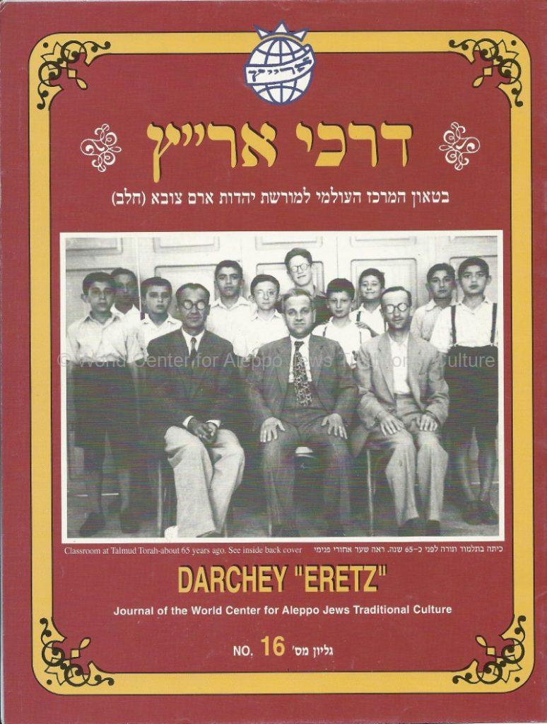 תמונת שער הקדמי: כיתה בבית ספר"תלמוד תורה" בשכונת הג׳מילייה בחלב בשנת 1949 – מלפני כ-65 שנה. בקדמת התמונה, במרכז, " מיסיו פרג' " – הוא פרג' ששון שניהל את בית הספר במשך שנים רבות. בימין של התמונה: חכם שחוד שרים זצ״ל (נפטר בסאו פאולו-ברזיל). ומשמאל התמונה: המורה יוסף ג׳מאל יבל״א, הנודע כ״אל-איסתאז״ (המורה), תושב פנמה כיום. אוסף שאול עבאדי-תל אביב.