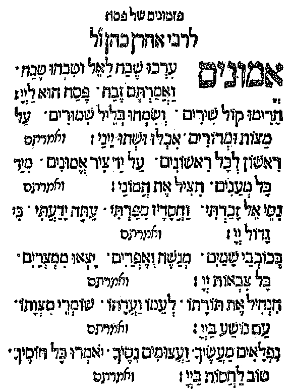 פזמון לפסח -“אמונים” פיוטים ושירים קהילתייםפסח להאזנה לפיוט לחצו על Play https://www.pizmonim.org/MP3/habusha%20emunim.mp3 החזן ר׳ משה חבושה פיזמון וצילום באדיבות PIZMONIM.COM צילום ממחזור ארם צובא – 1527