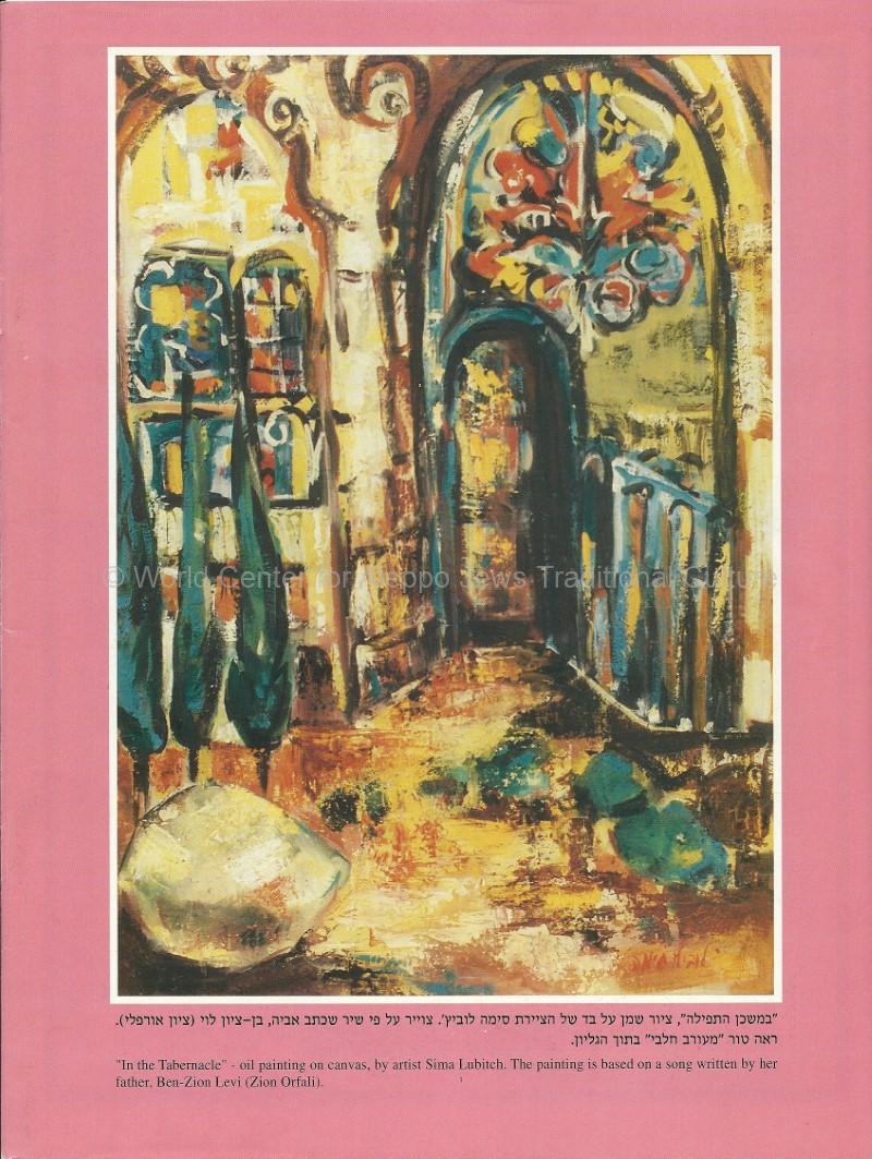 תמונת השער האחורי: ״במשכן התפילה״, ציור שמן על בד של הציירת סימה לוביץ׳. צוייר על פי שיר שכתב אביה, בן—ציון לוי(ציון אורפלי). ראה טור ״מעורב חלבי״ בתוך הגליון.